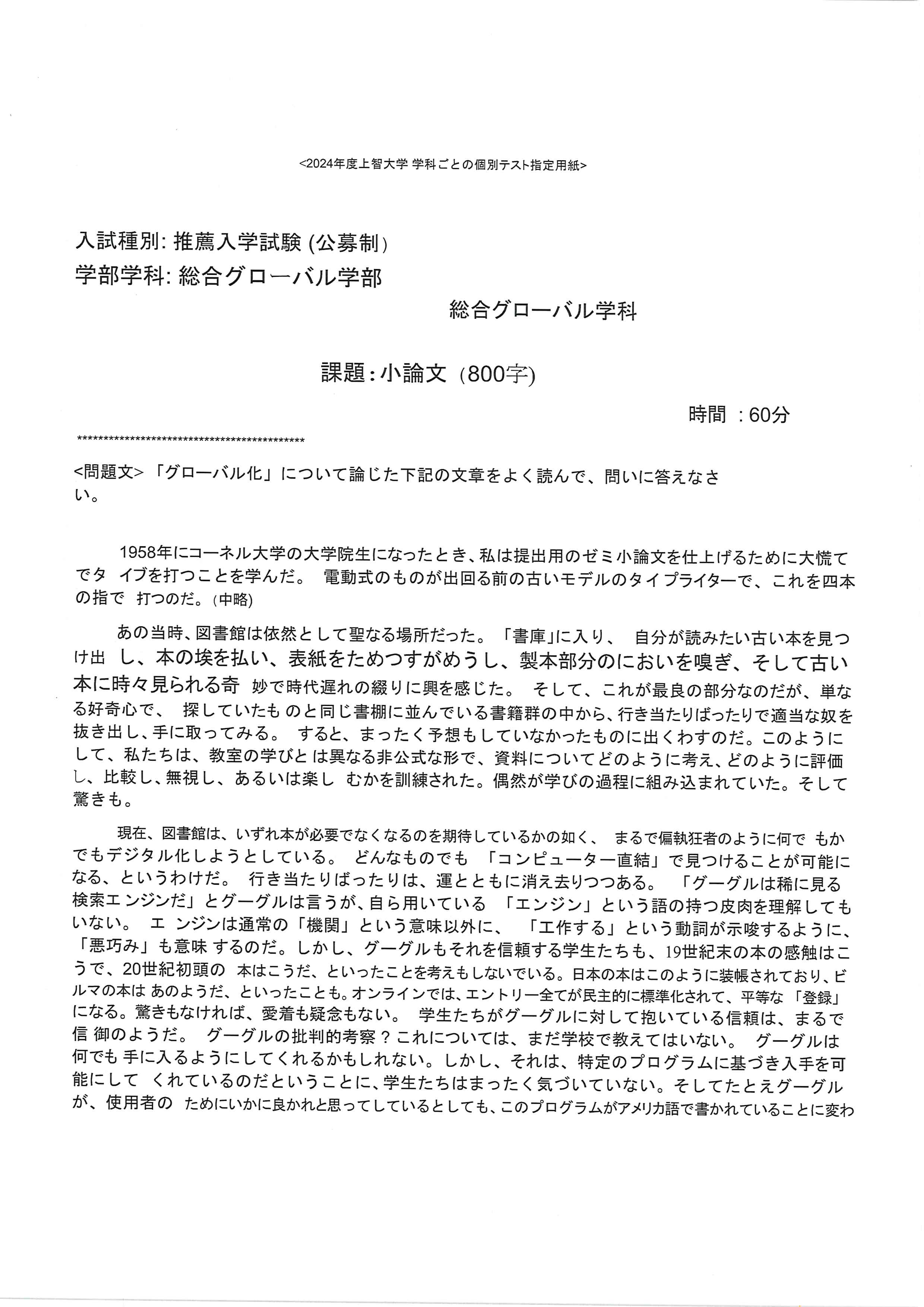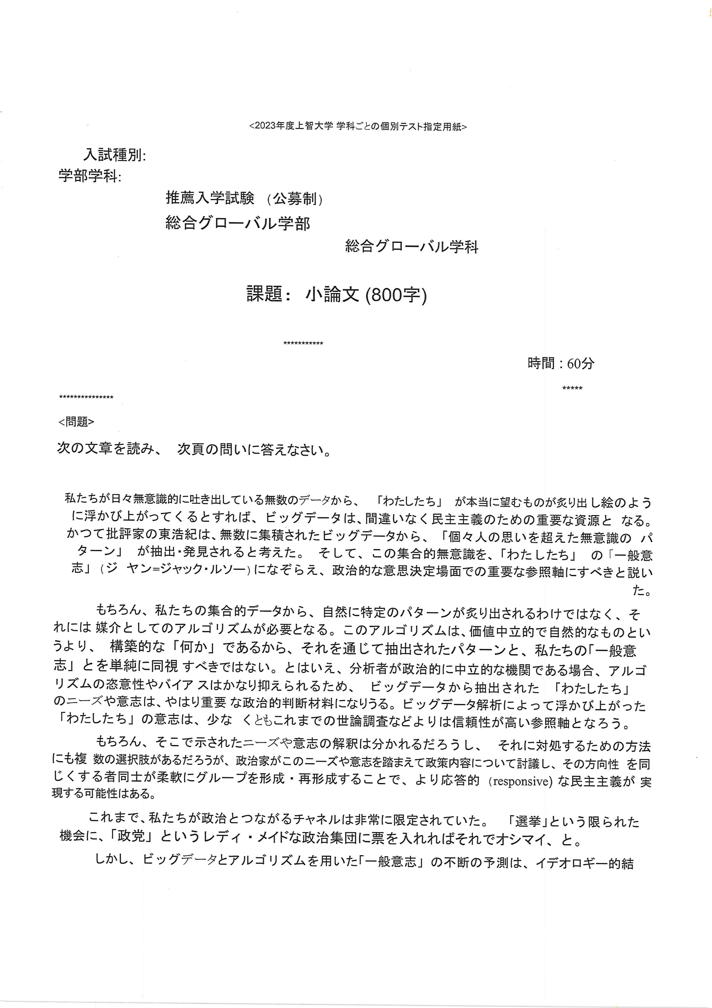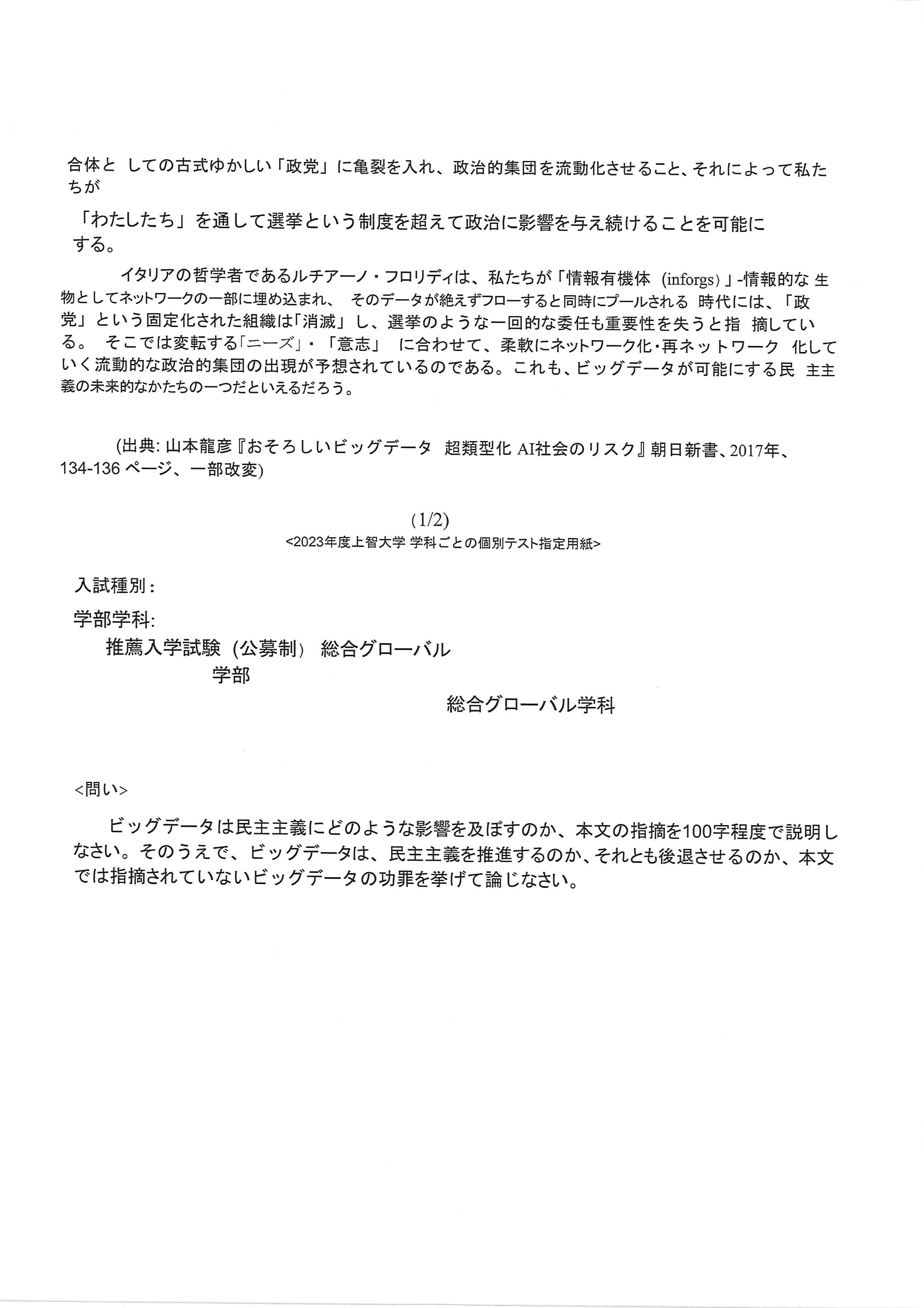 慶應義塾大学 Fit A 論述試験 2019年 慶應義塾大学 Fit A 論述試験 2019年 Fit 入試 A 方式は、50 分の模擬講義を聴講した上で論述します。試験時間 45 分、書式は A3 レポート用紙形式、字数制限なし。(※講義の詳細まではわからないので、講義のテーマから類推して論述の方向性を例示します。)
