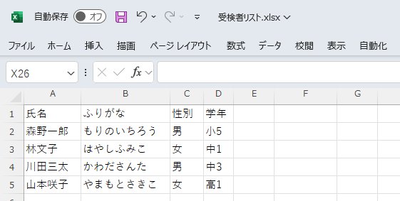 受検者リストは、Excelファイル又はCSVファイルでお願いします。